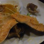 日本酒の会は料理が多いので、食べ終わるか終わらないかくらいで新しい料理を皿に乗せられる。鮭もしいたけの上に乗せられました。鮭のあらですかね。これがまた美味しくって、ご飯欲しくなる。仕込みにどれだけの手間ひまかけてるのか。