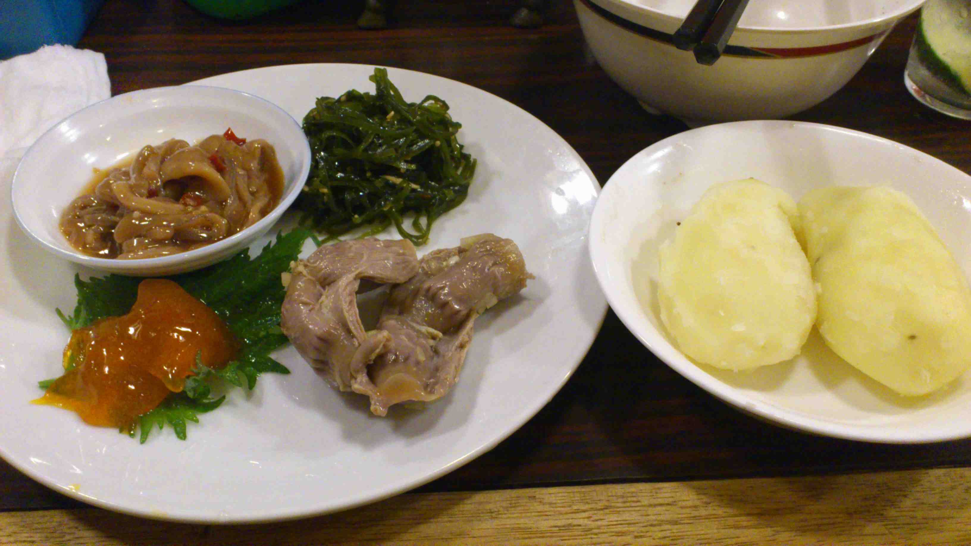 お皿に料理がいっぱいあるので、まずはイモから。蒸かした(電子レンジでチンした)イモですが、このイモにしおからを乗せてがぶりと行きます。このしおからが美味しい。普通の塩辛じゃないです。全然生臭くない。藤田さんがしおからじゃない。もっと高級な何とかだって言ってましたが忘れました。正直これだけでも十分。