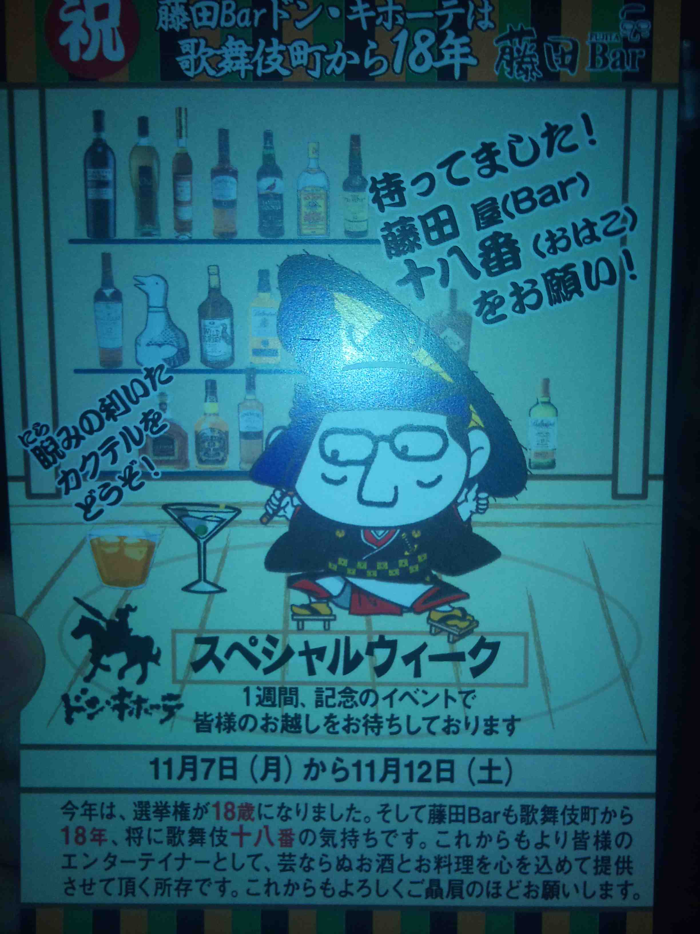 18周年記念 管理人投稿 藤田Barの思い出 への投稿 2016年10月25日 投稿者:yuchi2501 11月は藤田バーオープン記念です。 今年は18周年。毎年送られてくる案内のハガキは毎回デザインが違うので楽しみ。 イベント期間は11月7日(月)〜11月12日(土)です。 ご祝儀もってまた行かねば! イベントがあると普段来られない常連さんにも会えるので毎日通う事になりそうです。 そして今日はなぜかマグロの漬け丼があったのでいただく。 賄いバーだなぁとしみじみ思う。